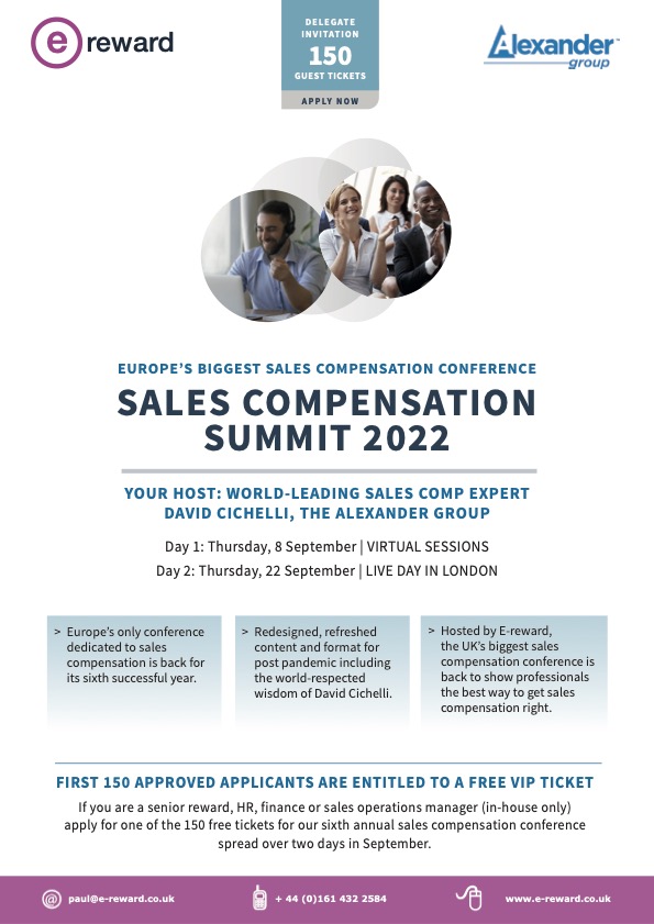 Enjoy these four MASTERCLASSES presentations from last year's (virtual) Sales Compensation Summit. If you enjoy them, Europe’s biggest conference dedicated to sales compensation is back for its sixth successful year in September. We have 150 FREE tickets for (in-house) reward, HR, sales and finance practitioners for this event taking place over two days – one live-streamed afternoon, 8 September, followed by a full day in central London, 22 September. You can attend just the virtual event or just the London conference or both days. The choice is yours.